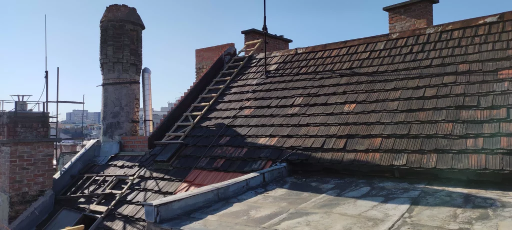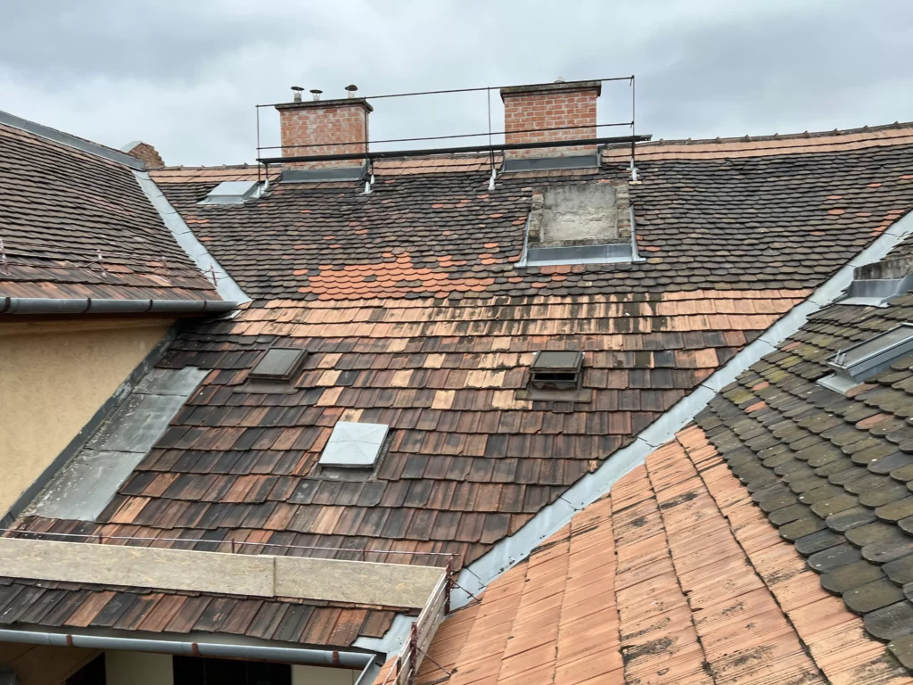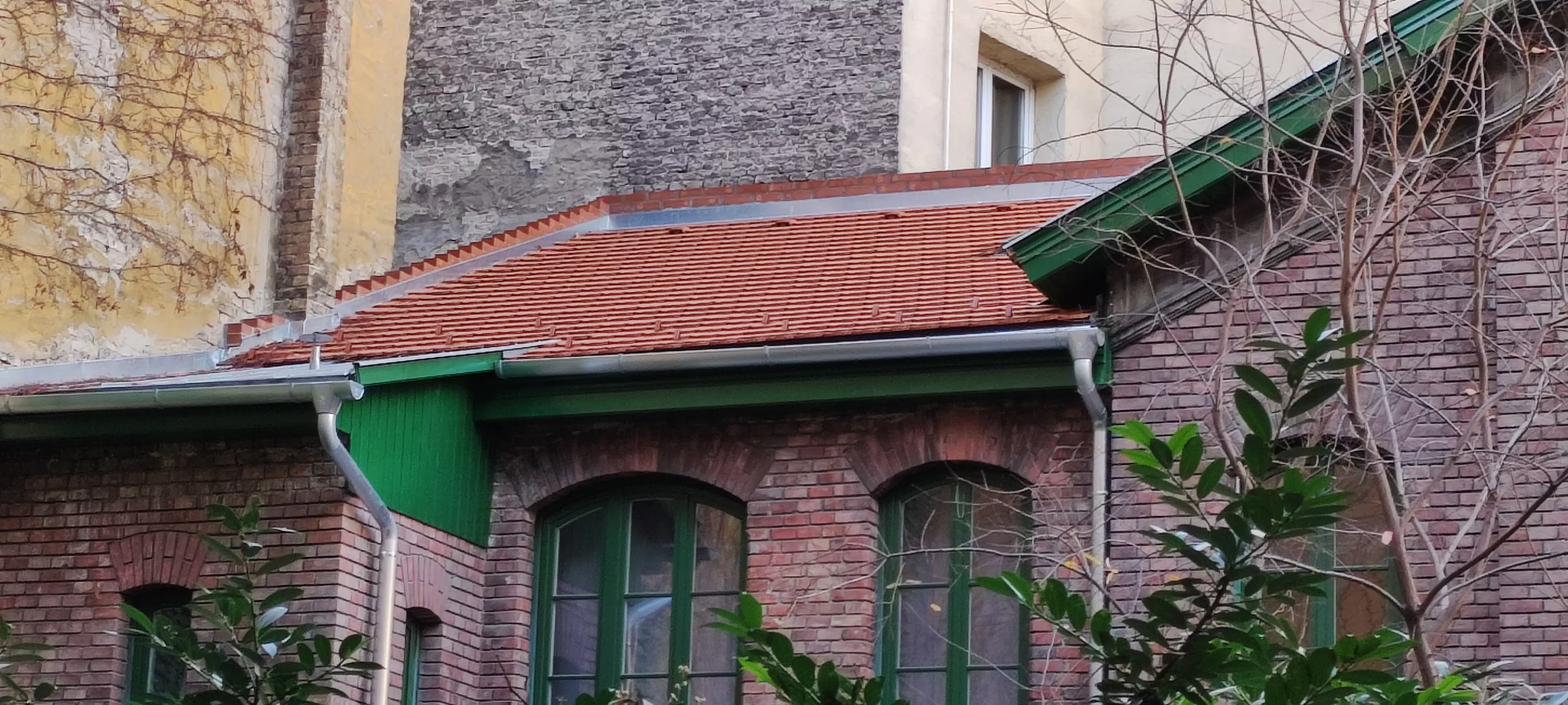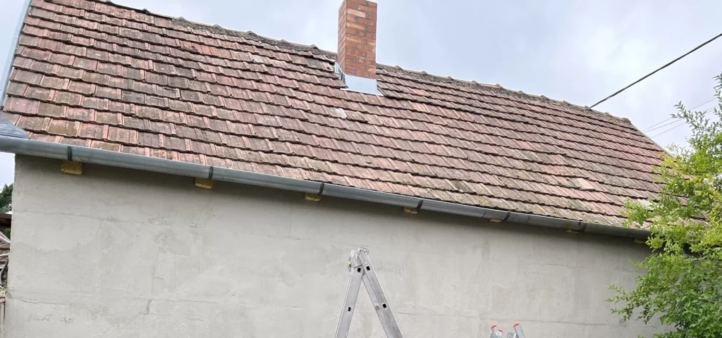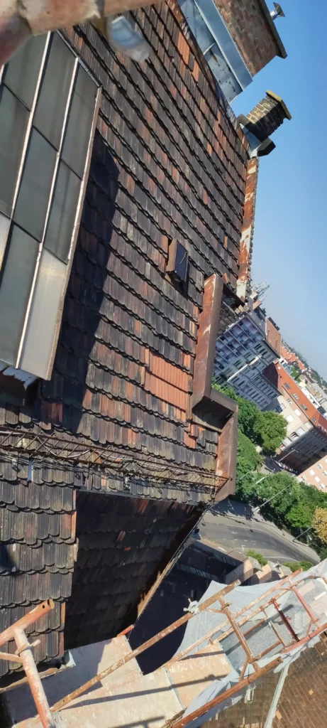 - A tető régi hódfarkú cseréppel volt fedve, a bádogszegélyek több helyen lyukasak voltak, a tűzfalak, macskalépcsők romosak voltak, a tetőgerincen horganyzott acéllemezből készült korcolt fedés rozsdás, több helyen lyukas volt, csakúgy, mint az ereszcsatornák is.