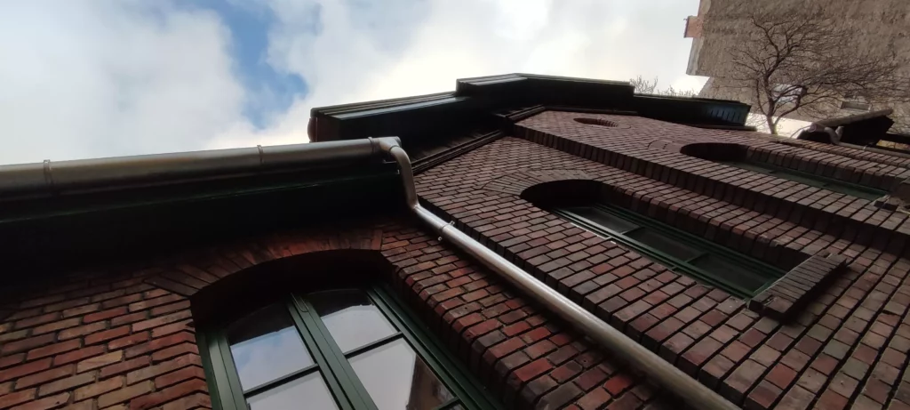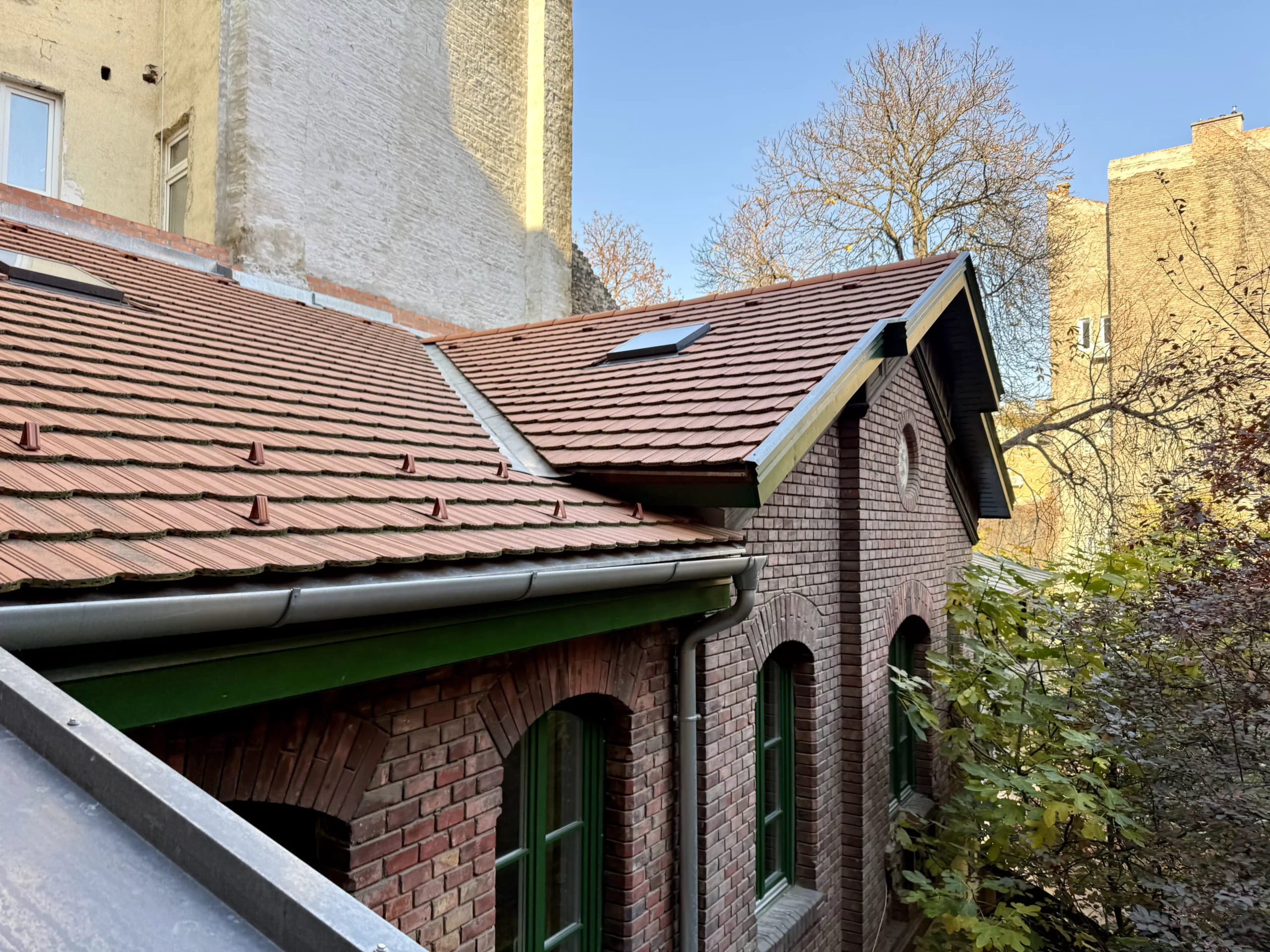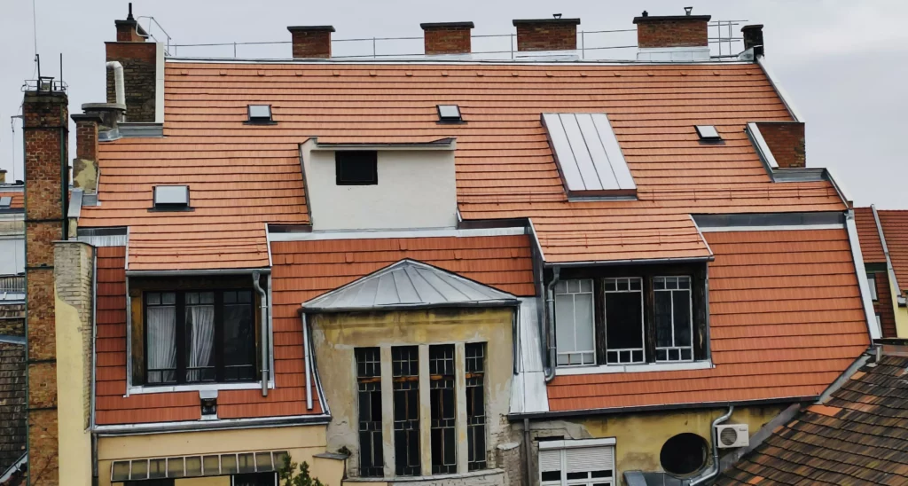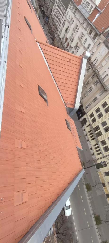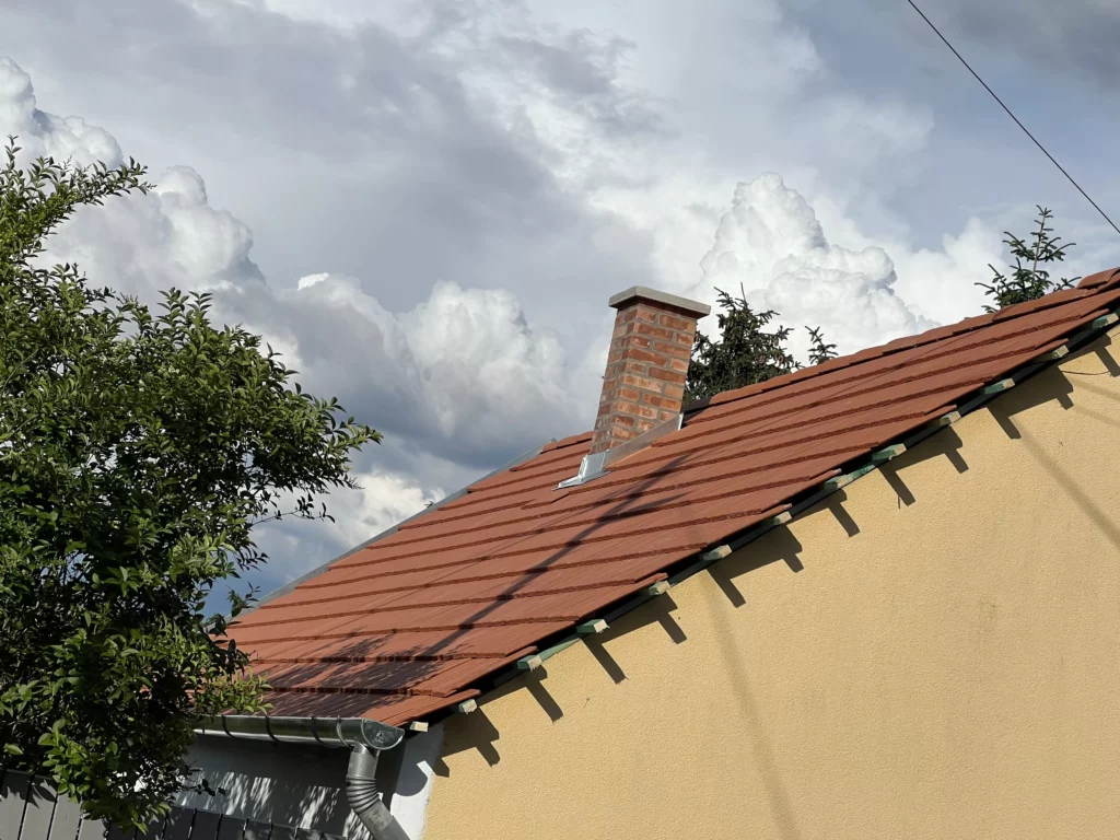 - A tető régi hódfarkú cseréppel volt fedve, a bádogszegélyek több helyen lyukasak voltak, a tűzfalak, macskalépcsők romosak voltak, a tetőgerincen horganyzott acéllemezből készült korcolt fedés rozsdás, több helyen lyukas volt, csakúgy, mint az ereszcsatornák is.