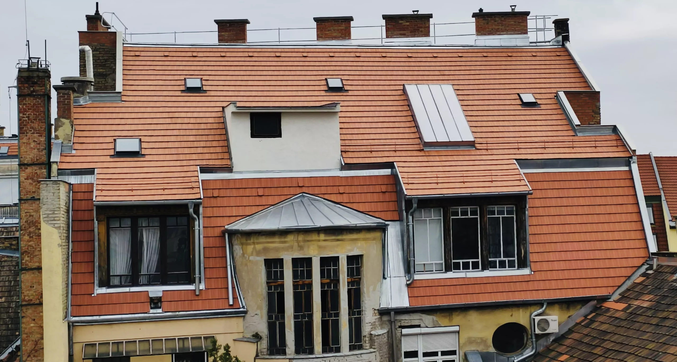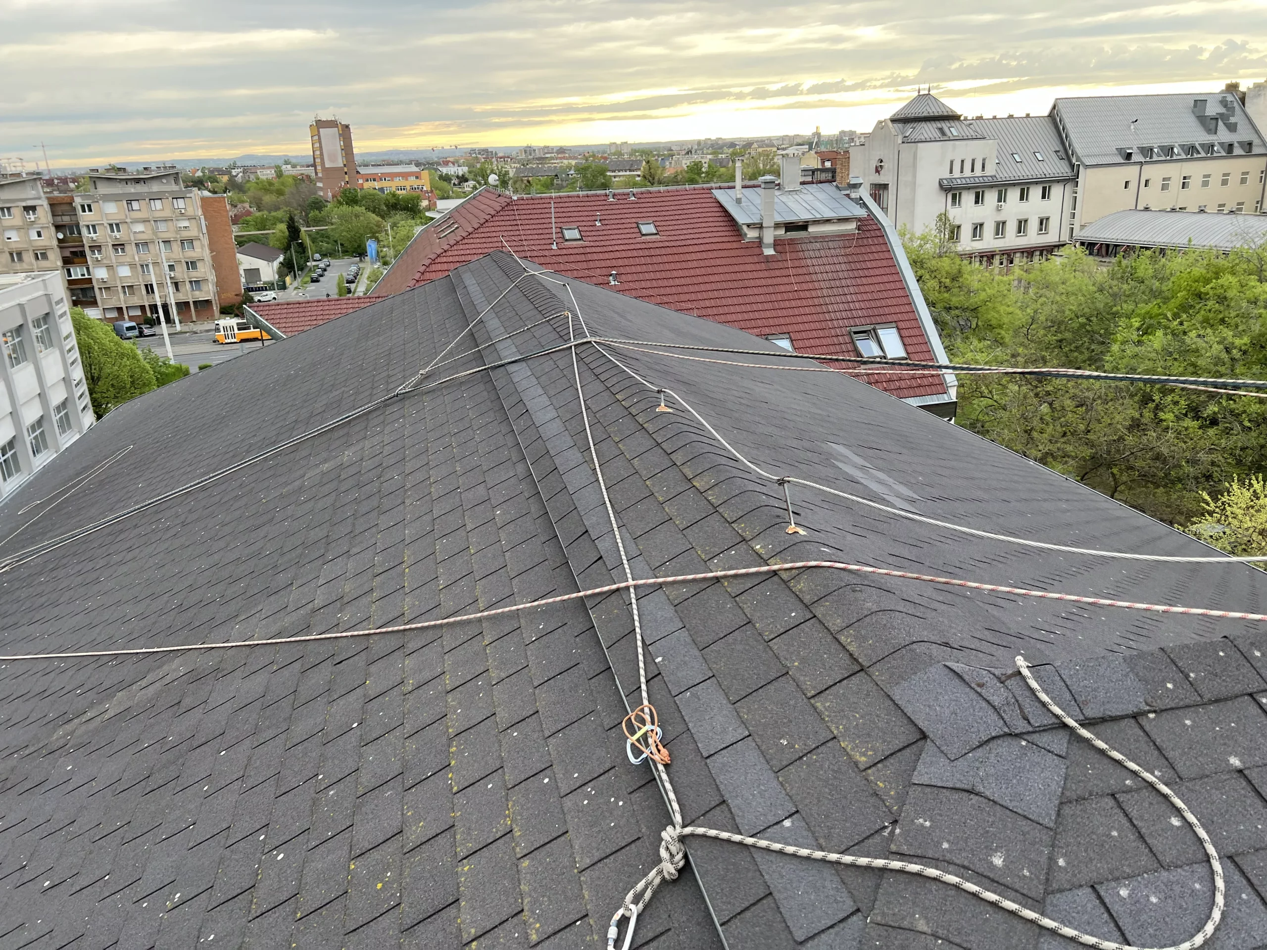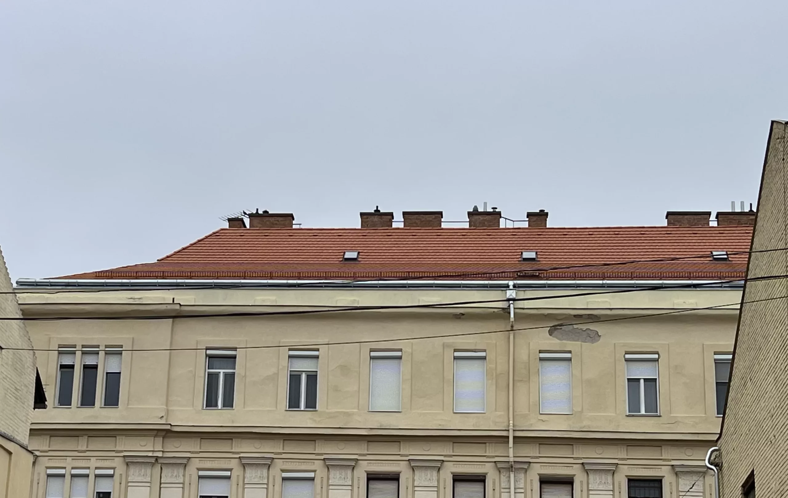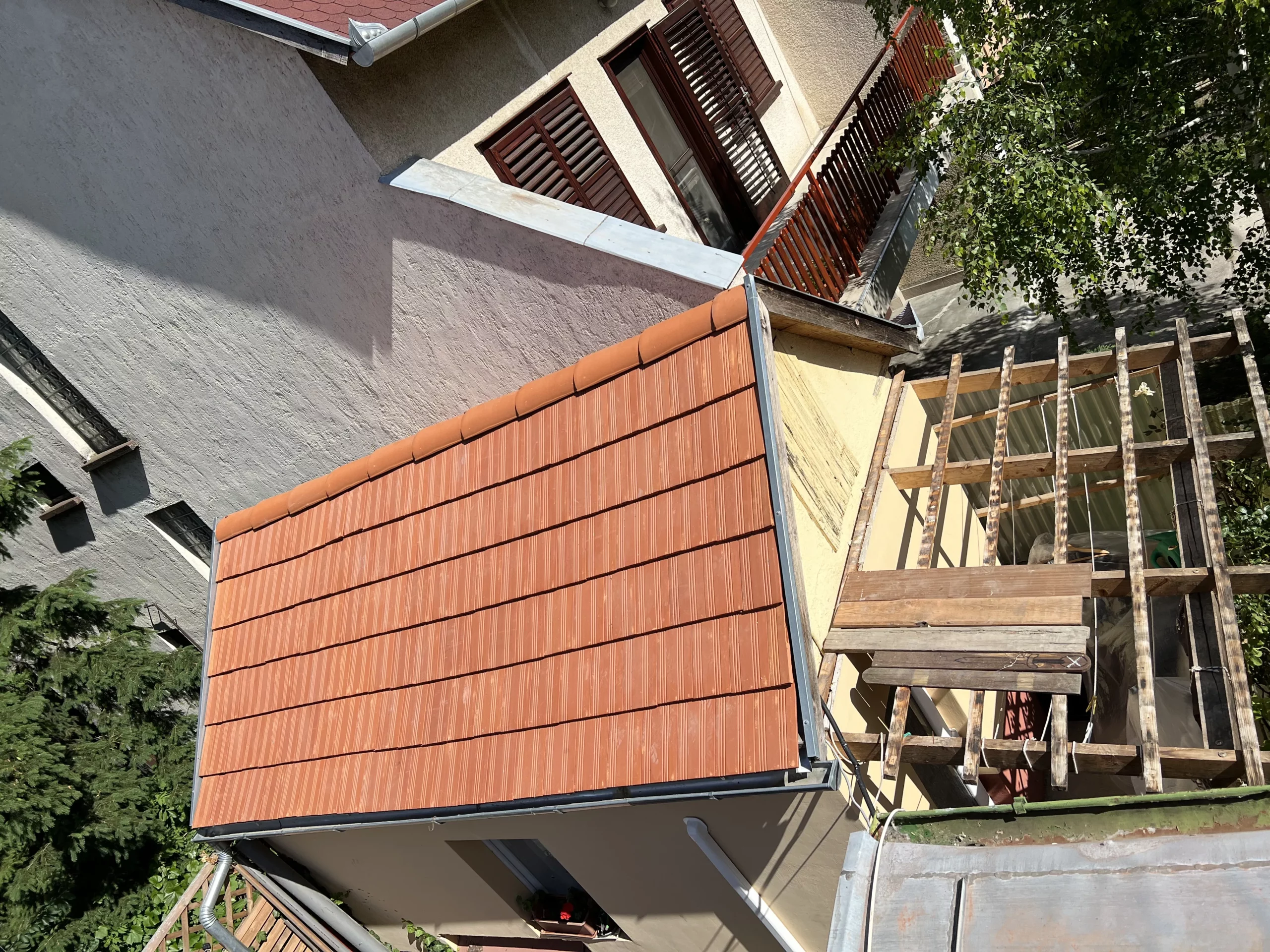 A társasház megrendelete az attikafal visszabontását, az attikacsatorna megszüntetését, új betonkoszorú öntését, macskalépcső újra falazását, a tetősík teljes felújítását, de most már új fekvőeresz kialakításával.