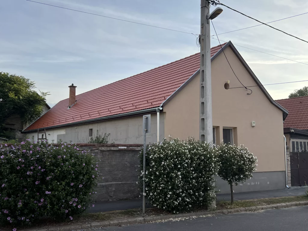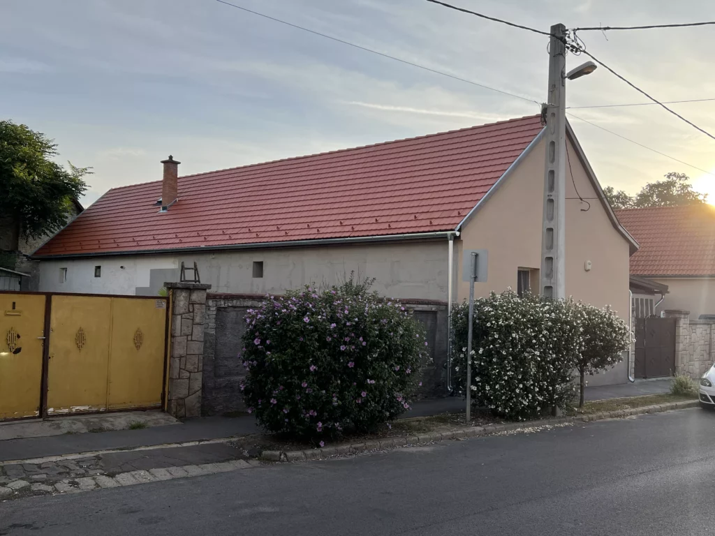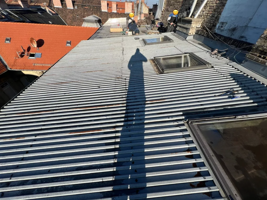 A tetőn régi, elöregedett trapézlemezfedés volt található.