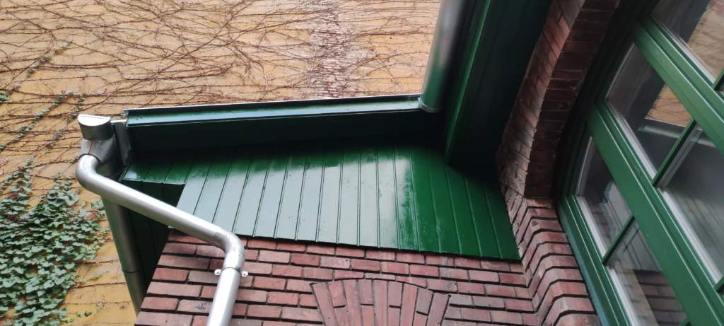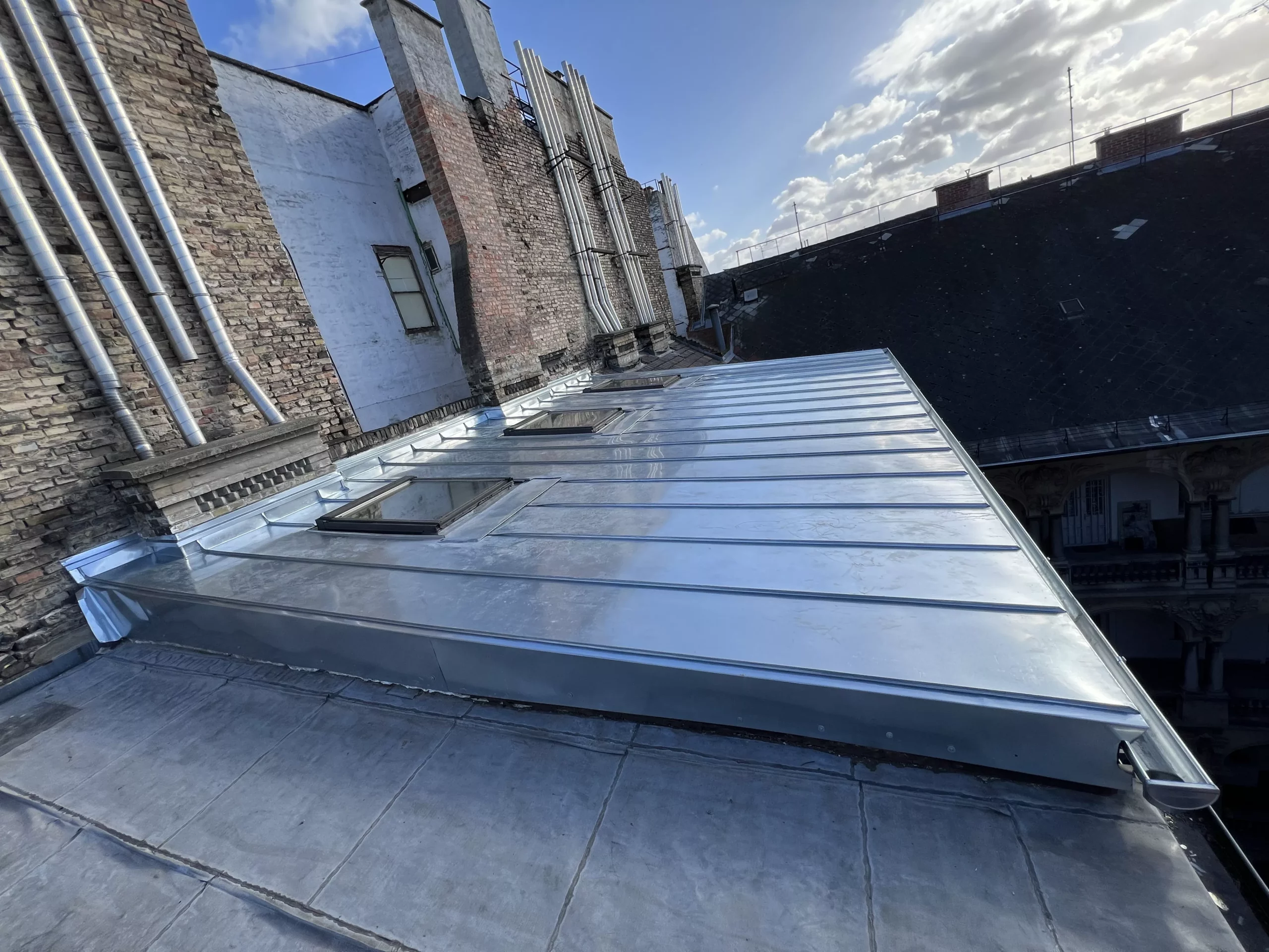 Új függőeresz kialakítása, majd alátétlemez fektetése után új állókorcos lemezfedés készítése horganyzott acéllemez használatával.
