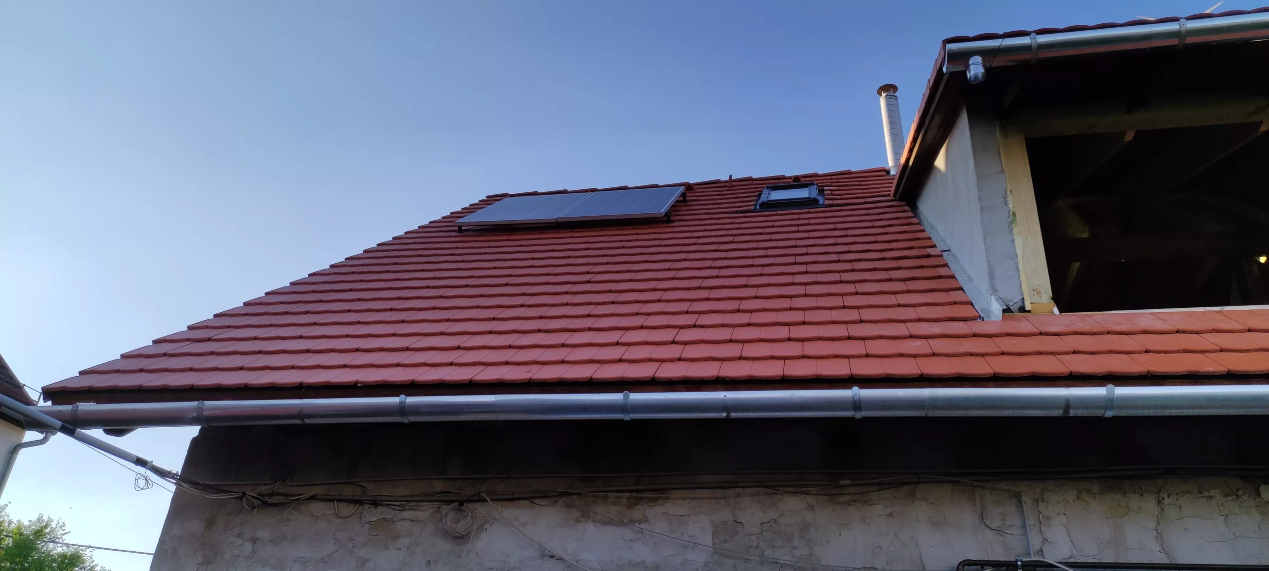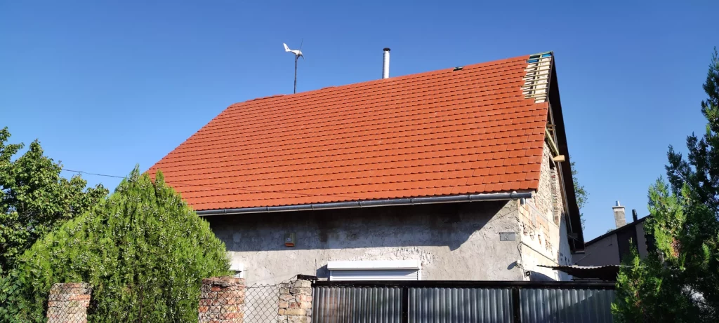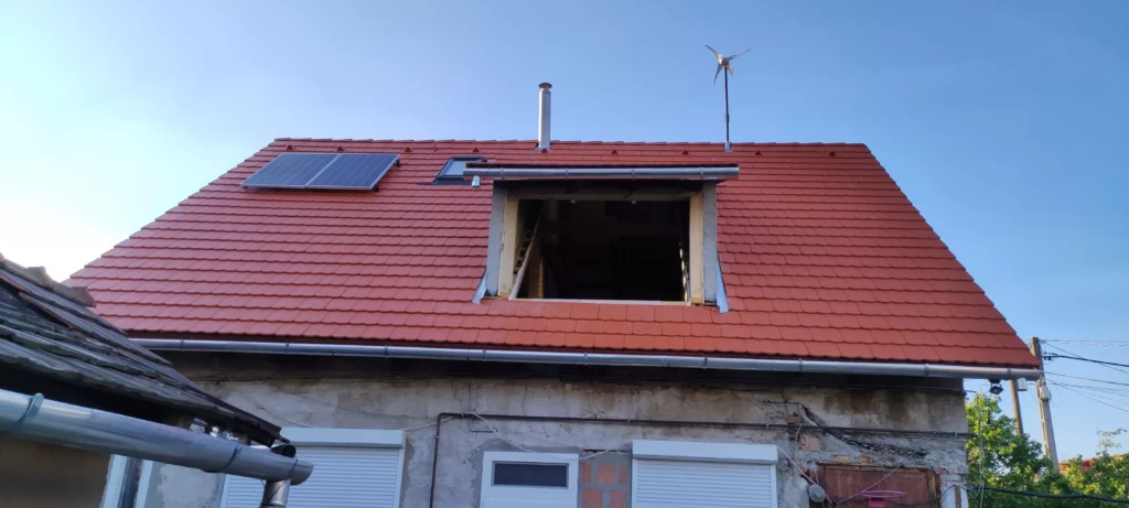- Elkészítettük a cserépfedést alátétet fólia terítéssel és Bramac síkbeton cserép használatával.