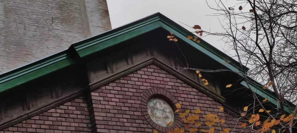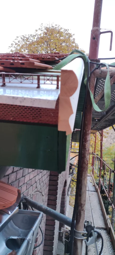 - Lépcsőház félkör formájú függőeresz készítése és félkúp tetőjére korcoltfedés készítése.