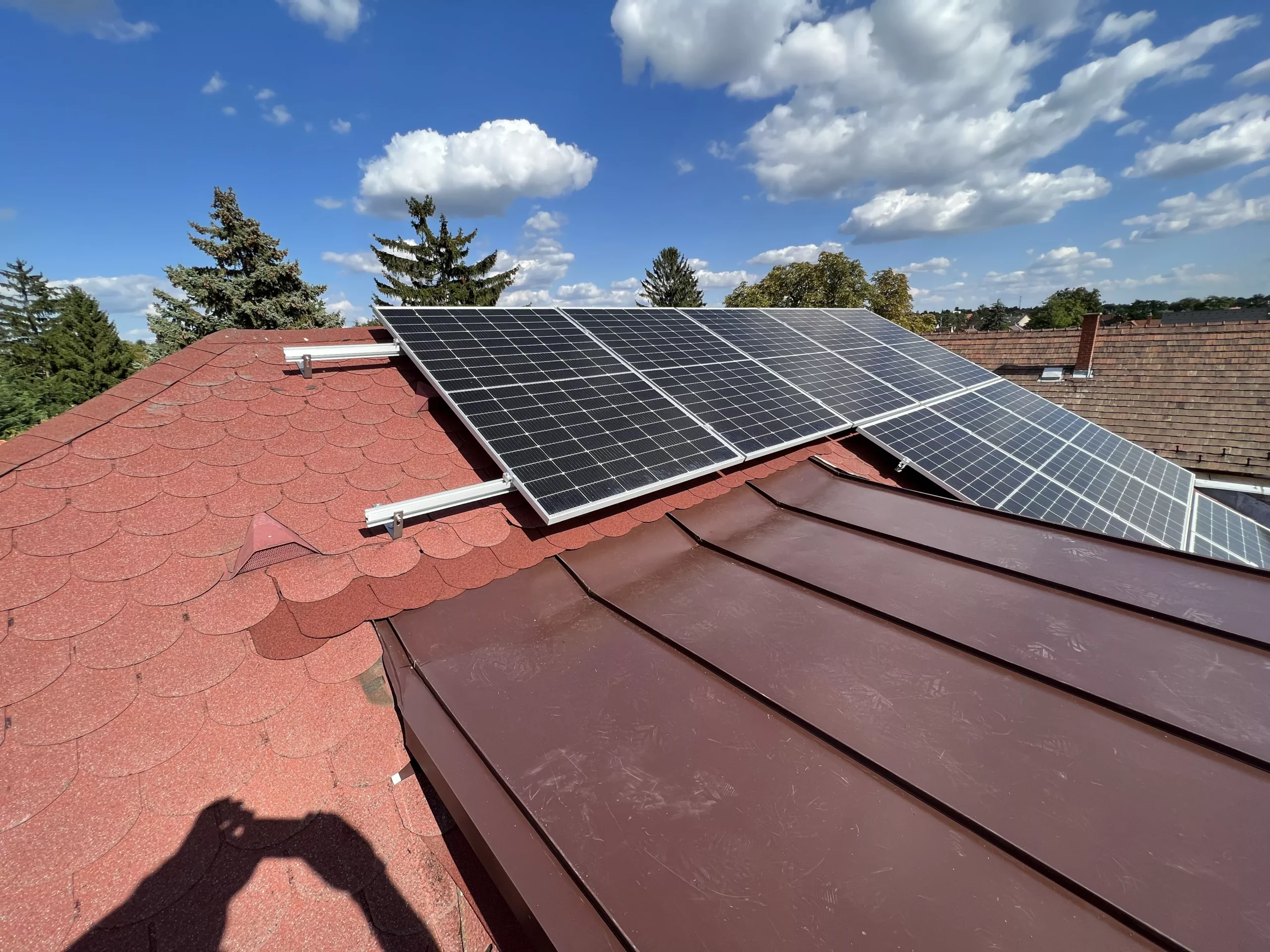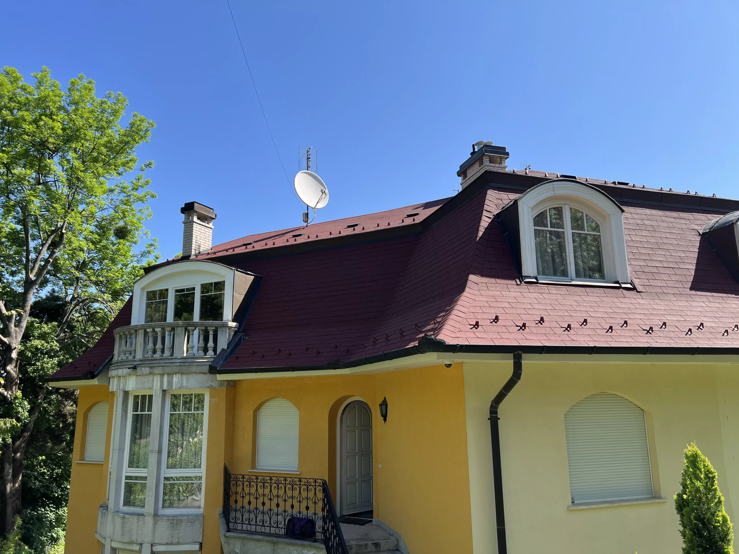 Kutyaólak teteje tönkrement, mert nem megfelelő fedést választottak erre az alacsony hajlásszögű tetőrészre. Ezt váltottuk ki korcolt lemezfedésre.